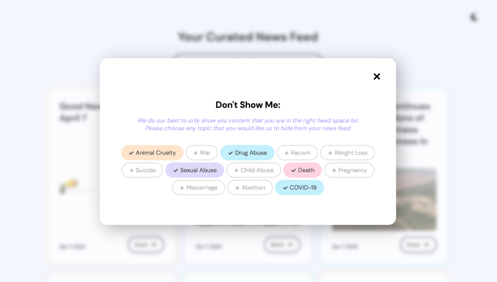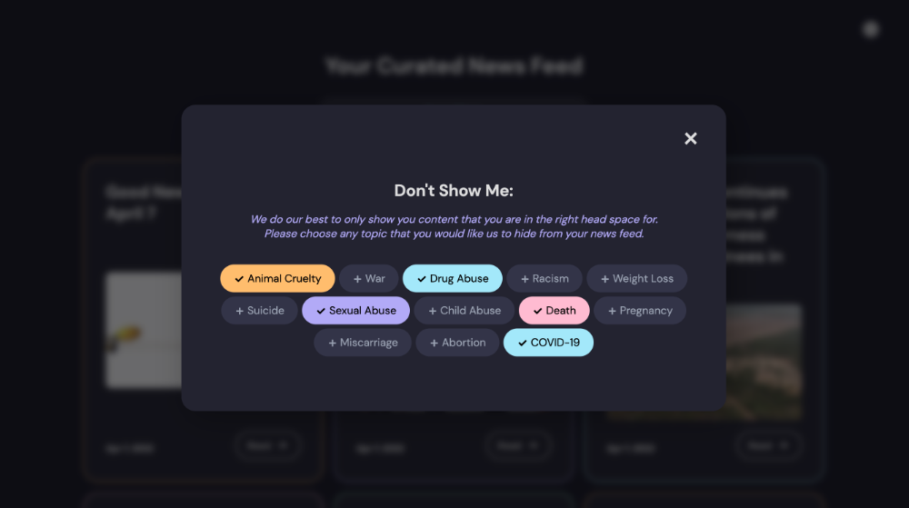 Safe Space News is a news platform that customizes your newsfeed to your life and preferences. Safe Space News will hide any articles that you may find upsetting or triggering. We offer a safe space filled with stress-free and positive news stories.