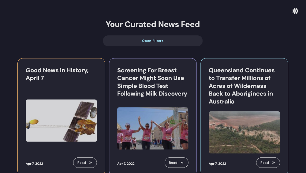 Using Node/Express/Cheerio, I created my own API by scraping positive news stories from various news sites. For the Frontend, I used React and React-Query to fetch my API data and filter it based on trigger words.